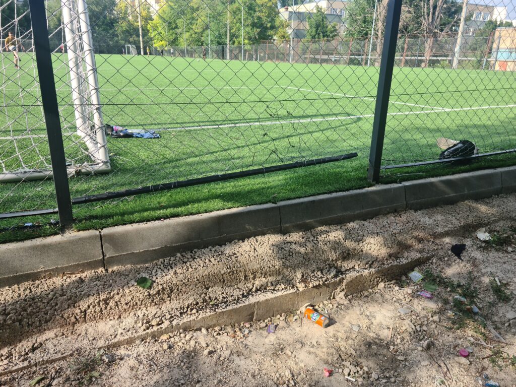 Далее. На территории стадиона установлен ещё один забор, который находится в ужаснейшем состоянии. Во многих местах просто-напросто отсутствует металлическая сетка. То есть, ребёнок, побежавший за мячом, рискует упасть в овраг и, как следствие, получить тяжёлые травмы. Разве это нормальное положение дел? Конечно же, нет!