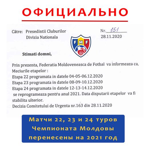 Из-за ужесточения карантинных мер в Молдове, три декабрьских тура национальной дивизии перенесены и будут сыграны уже в следующем году, после зимней паузы.